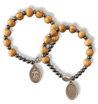Bransoletka z drzewa oliwnego z koralikami hematytowymi, na gumce z medalionem na którym znajduje się wizerunek Jezusa Miłosiernego.