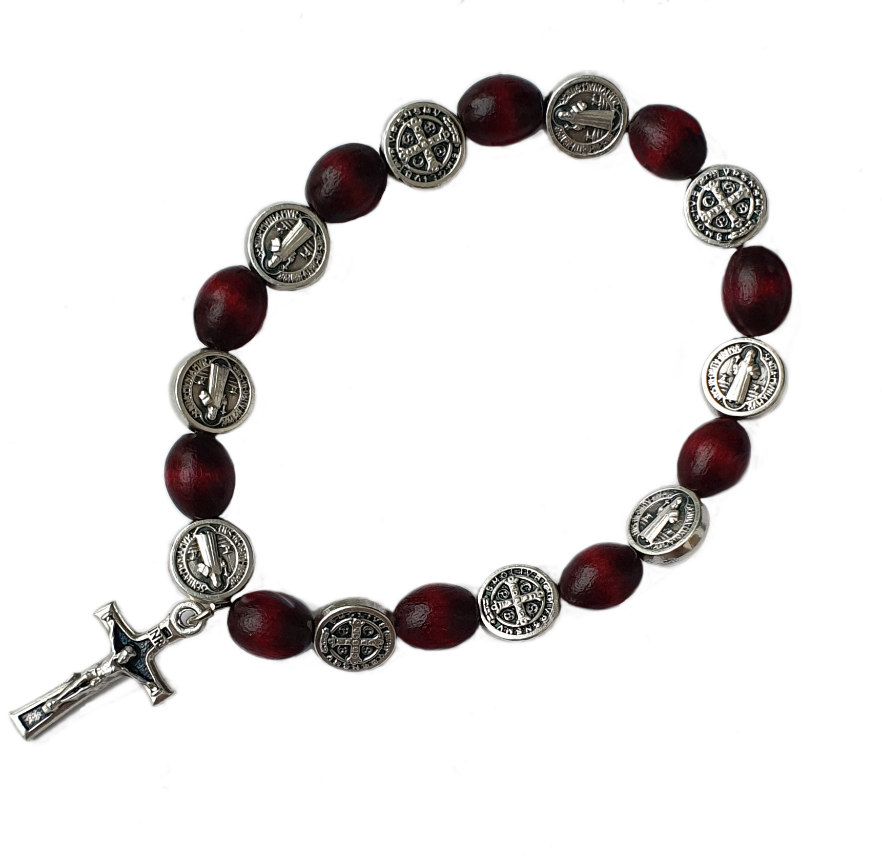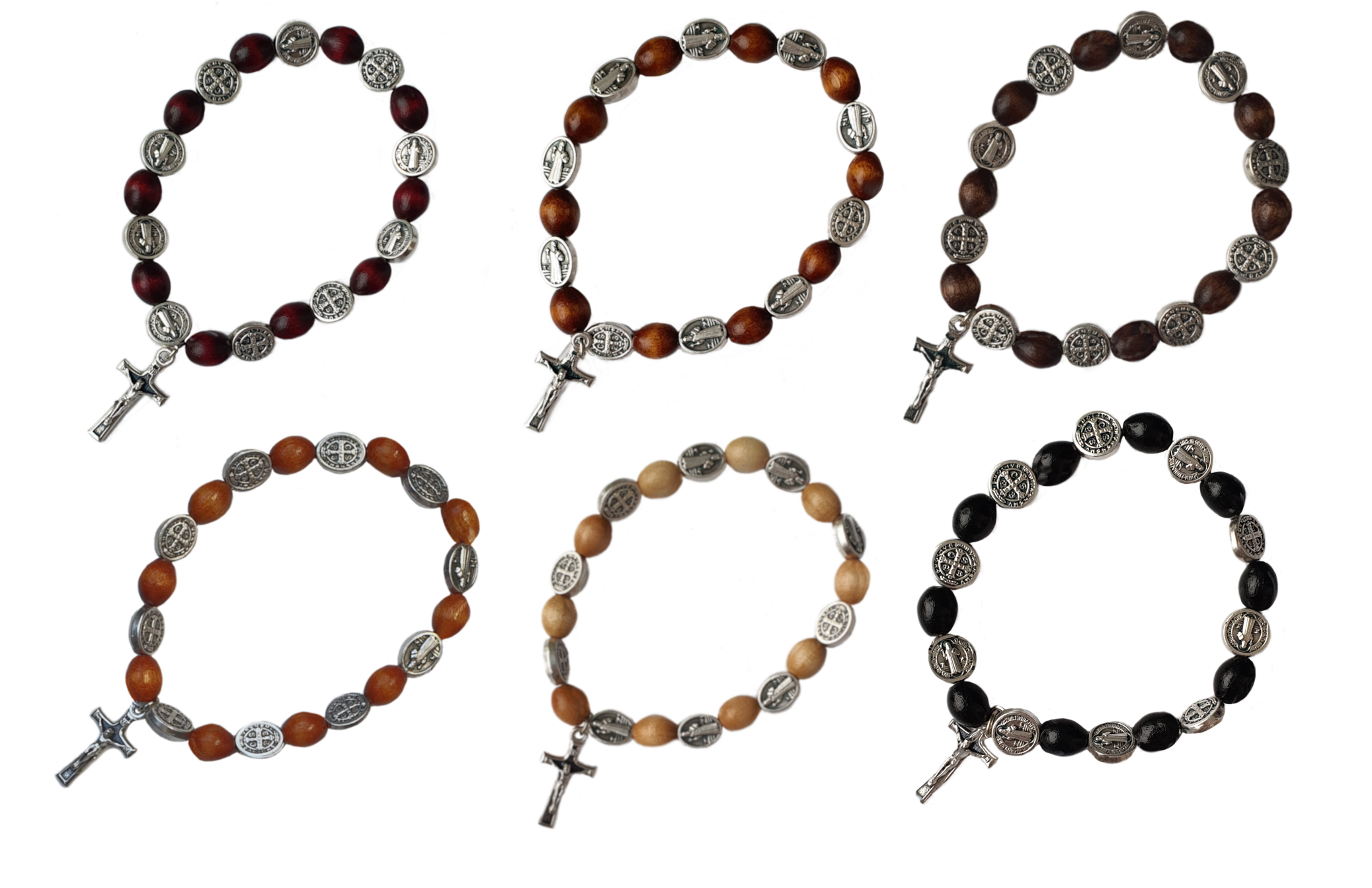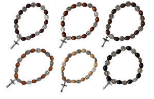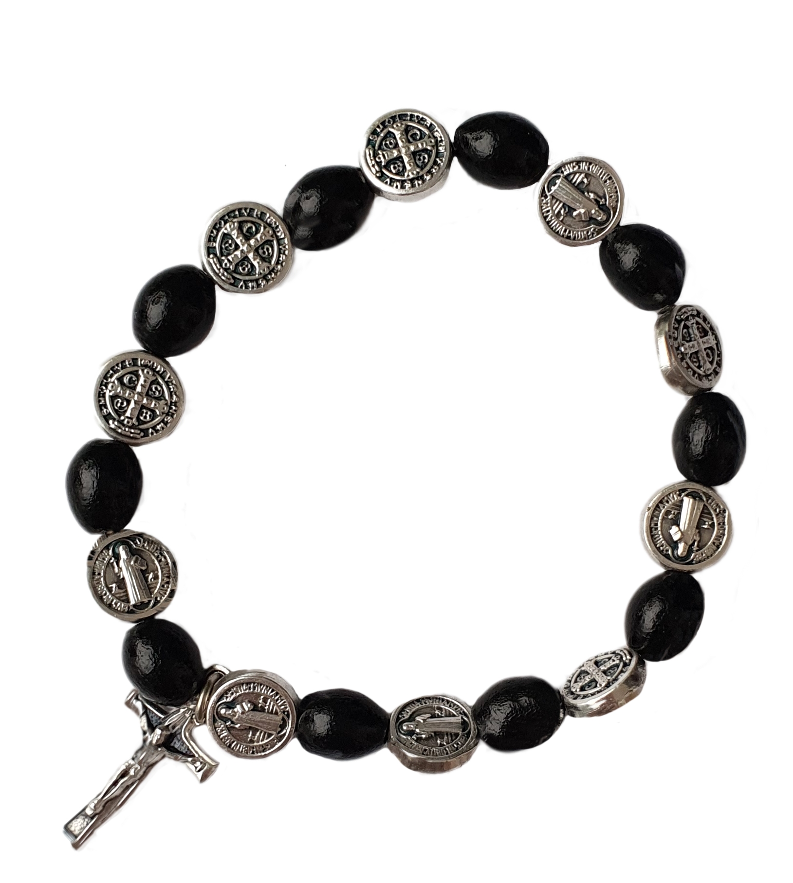 Bransoletka na gumce z koralikami i medalikami św. Benedykta, z krzyżykiem.