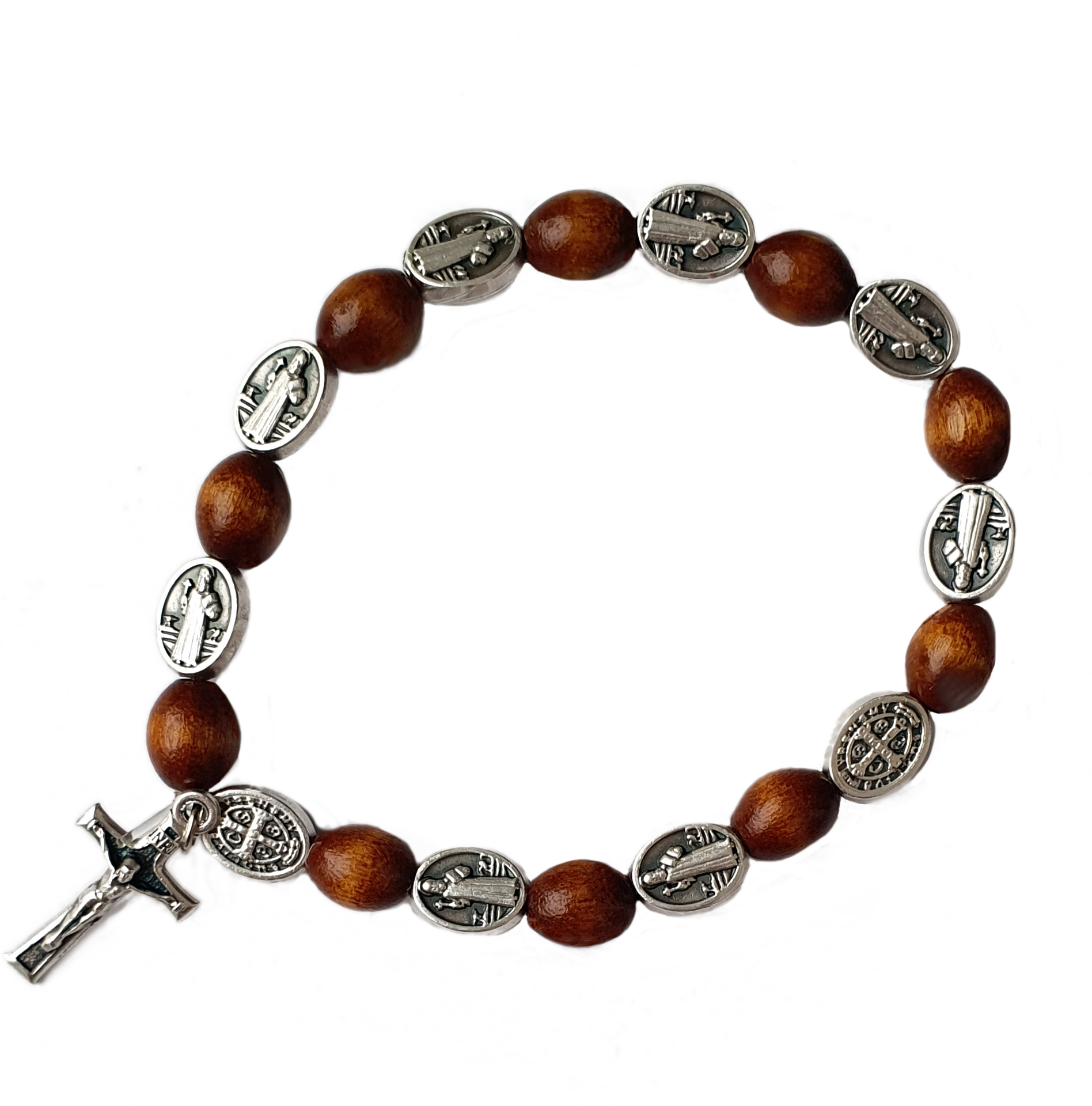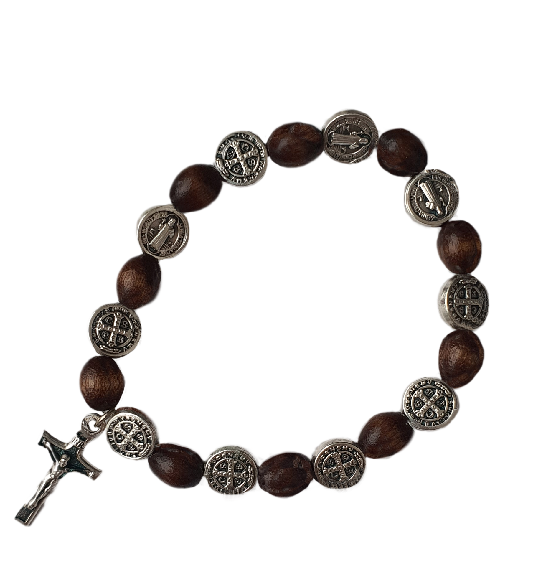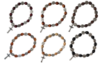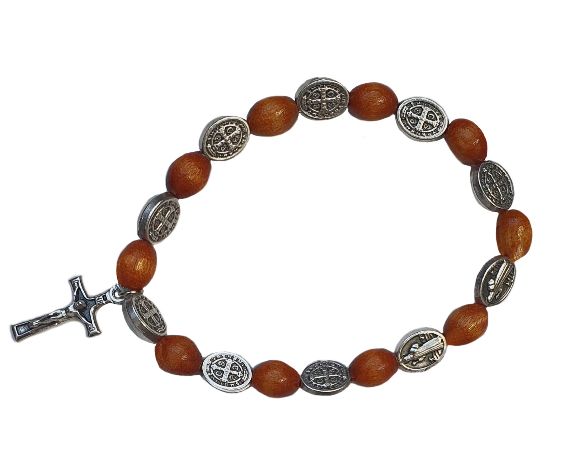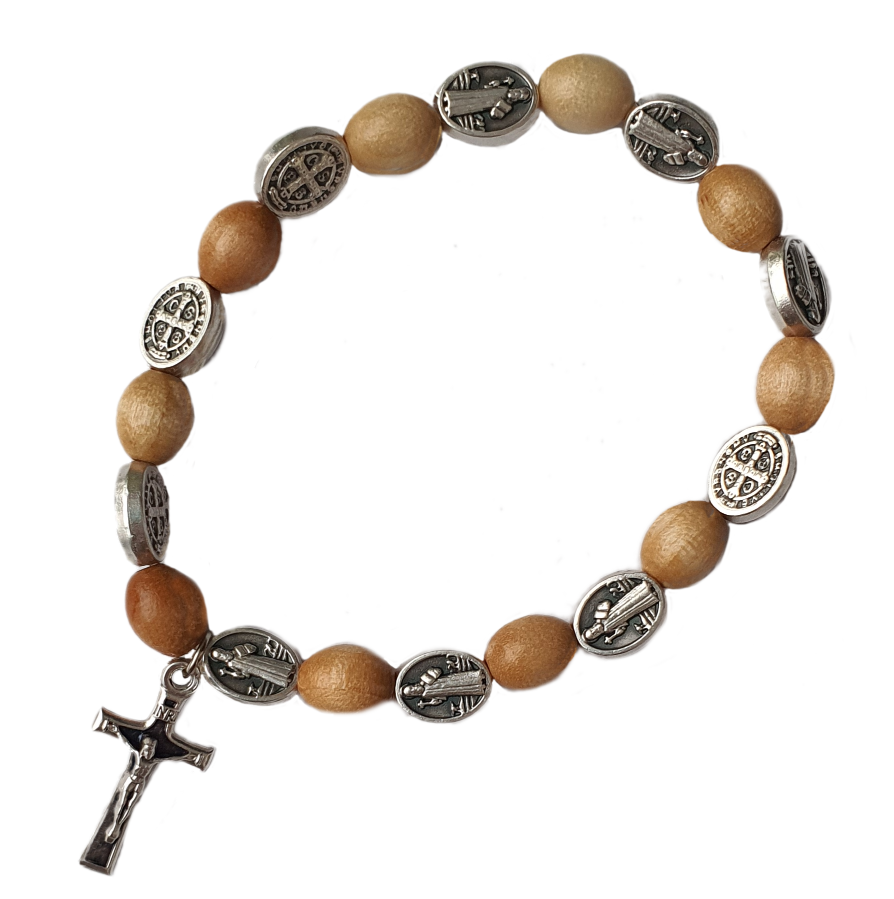 Bransoletka na gumce z koralikami i medalikami św. Benedykta, z krzyżykiem.