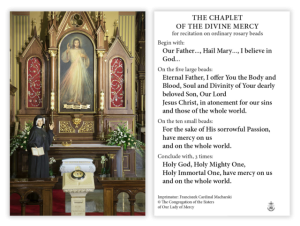 The front of this prayer card features a full-color image of the altar of the Sanctuary of Divine Mercy in Kraków-Łagiewniki and the Chaplet of the Divine Mercy is printed on the back.