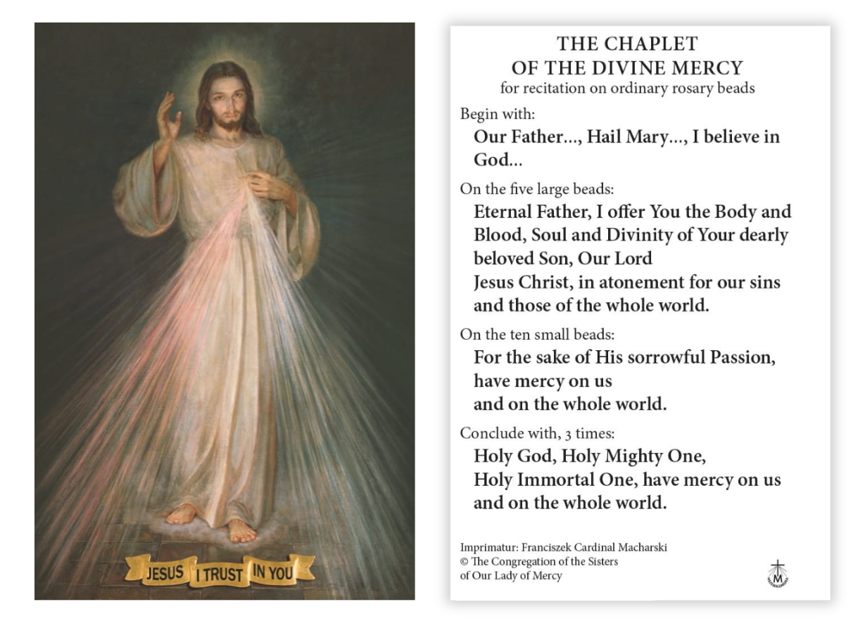 Large prayer card contains a color image of the Divine Mercy on the front, and instructions on how to pray the Chaplet of Divine Mercy on the back.