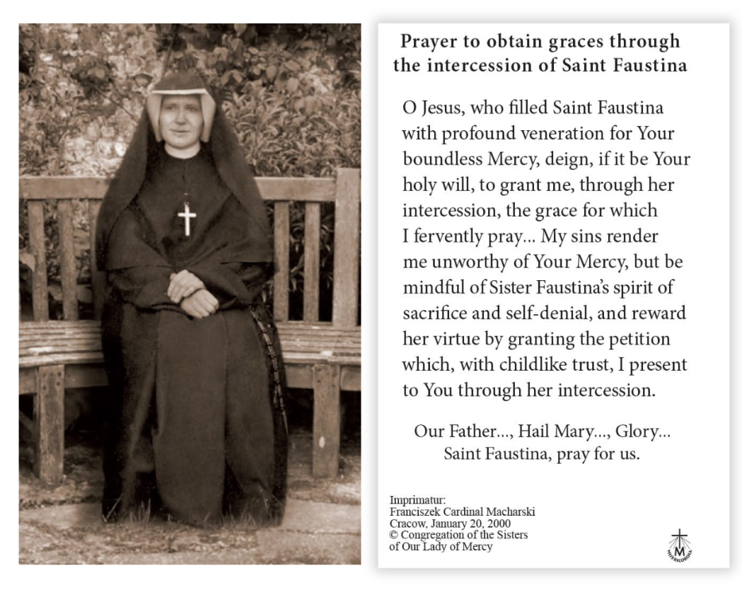 The front of this prayer card features image of Sister Faustina.