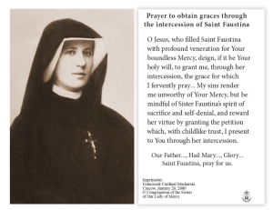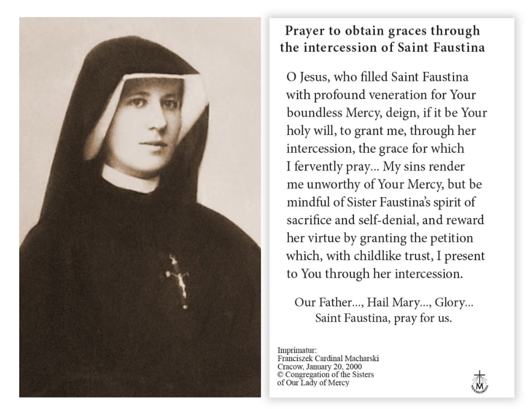 The front of this prayer card features image of Sister Faustina.