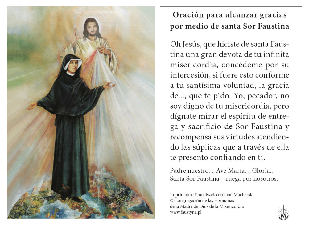 En el reverso, el texto de la oración pronunciada por el Santo Padre Juan Pablo II durante la ceremonia de canonización de Sor Faustina en St. Peter's en Roma, 30 de abril de 2000.