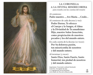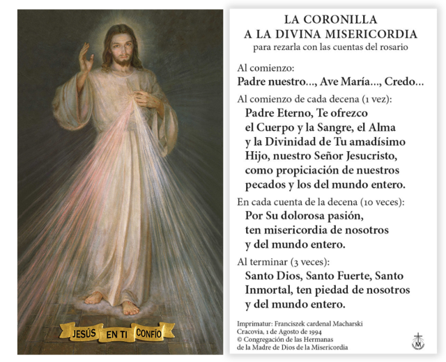 Estampa a color Jesús de la Divina Misericordia de la capilla del convento de la Congregación de las Hermanas de la Madre de Dios de la Misericordia en Cracovia-Lagiewniki, con la oración de la coronilla.
