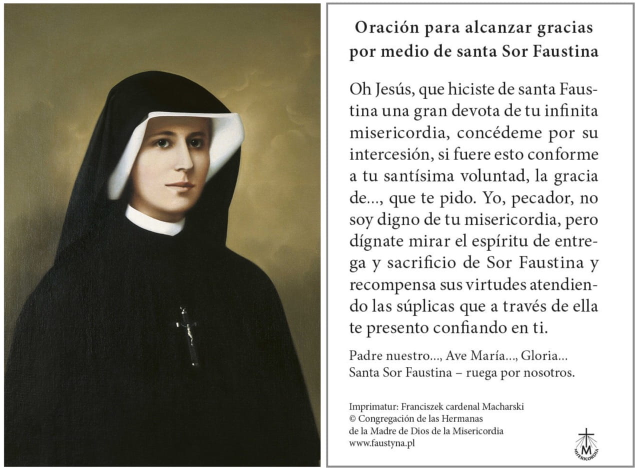 En la parte posterior la oración para alcanzar gracias por medio de santa Sor Faustina.