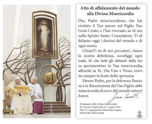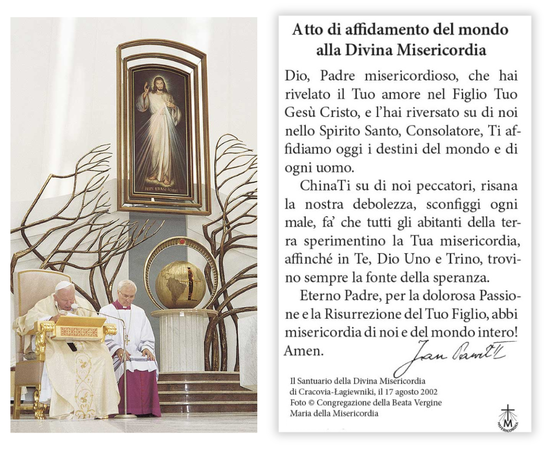 Sul retro si trova la preghiera dell'atto di affidamento del mondo alla Divina Misericordia.