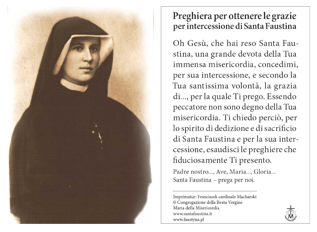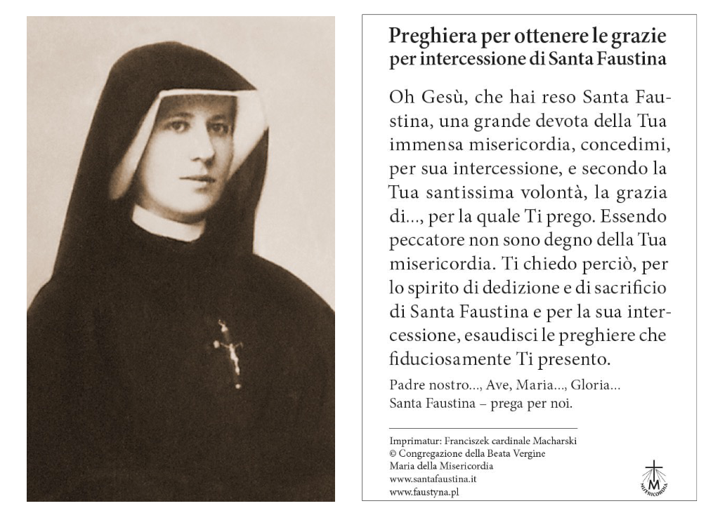 Immaginetta con il ritratto di santa Suor Faustina. Sul retro invece la preghiera di intercessione.