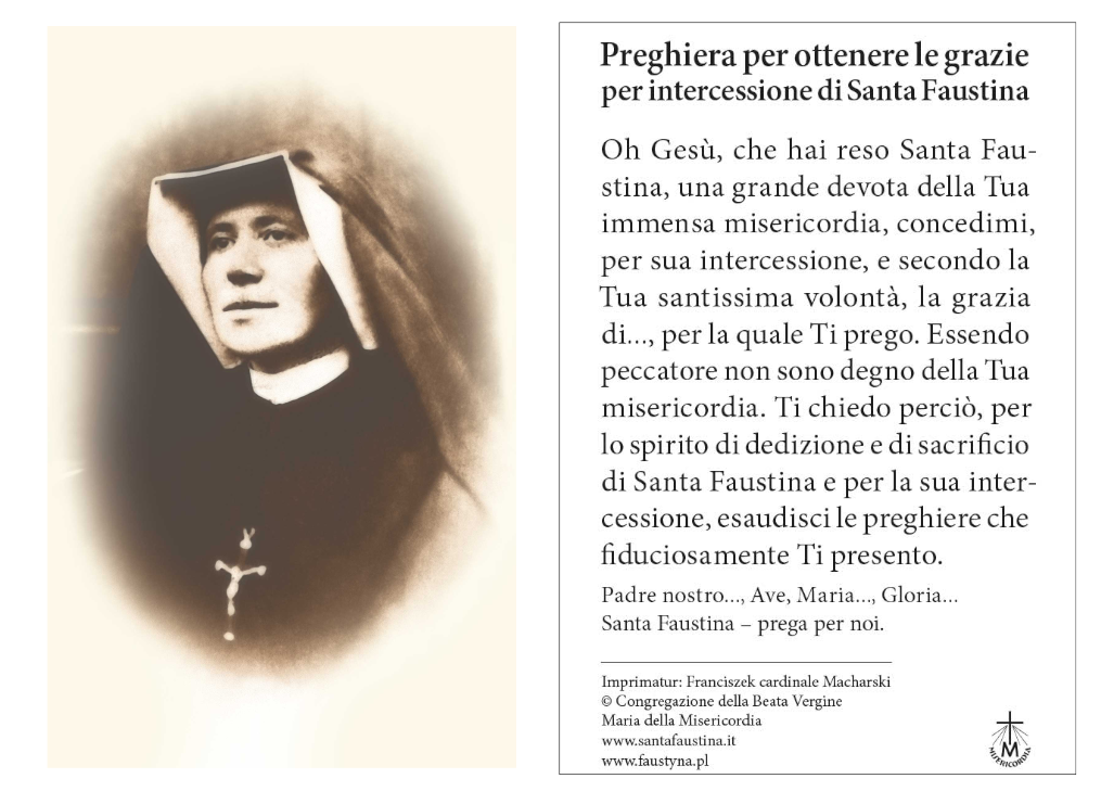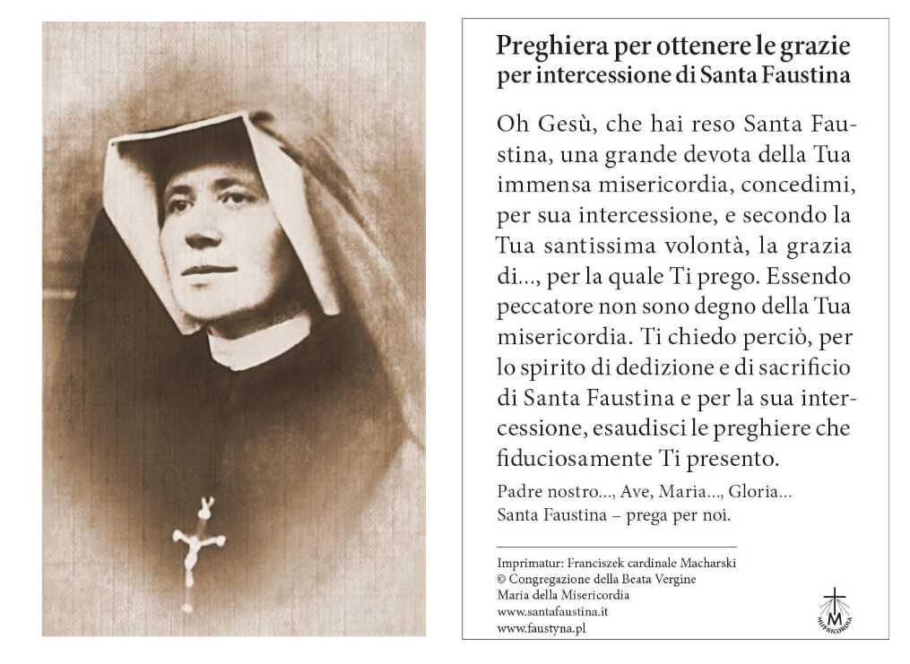 Immaginetta con il ritratto di santa Suor Faustina. Sul retro la preghiera di intercessione.