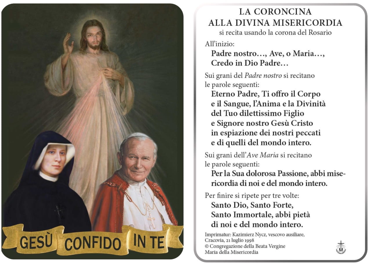 Immaginetta con la preghiera realizzata in pvc resistente. Sulla parte frontale: Gesù Misericordioso, san Giovanni Paolo II e santa Suor Faustina con la scritta: Gesù, confido in Te. Sul retro invece si trova il testo della coroncina alla Divina Misericordia.