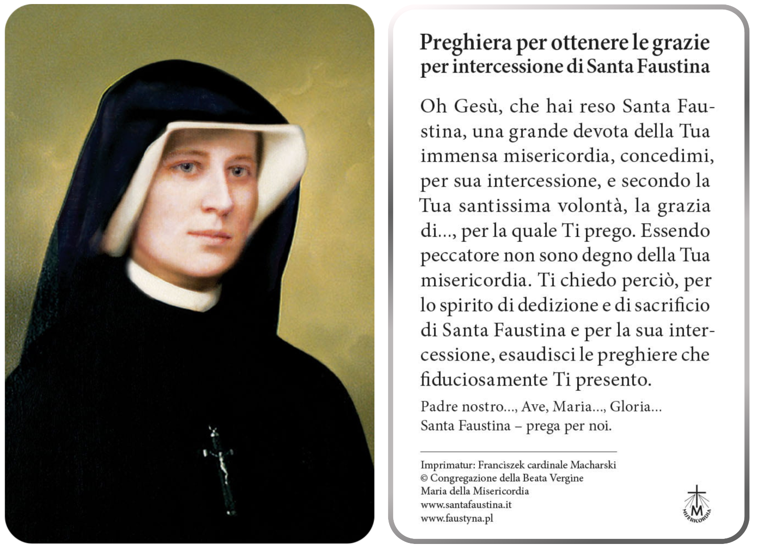 Immaginetta con la preghiera realizzata in pvc resistente. Sulla parte frontale e raffigurata santa Suor Faustina.