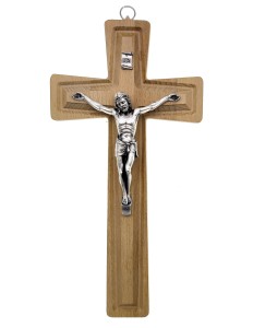 Krzyż drewniany z jasnego drewna.