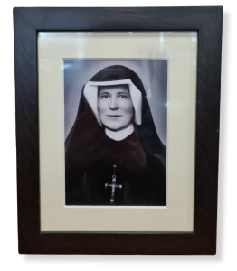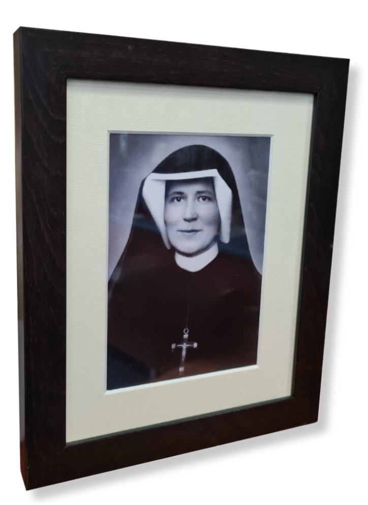 Wizerunek św. Siostry Faustyny, wydruk na papierze (b/n) z passe-partout w ramie drewnianej w kolorze czarnym z szybą.