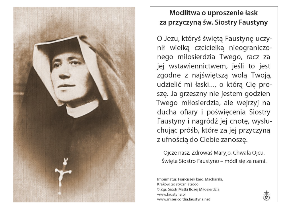 Na awersie fotografia św. Siostry Faustyny. Na rewersie natomiast znajduje się modlitwa o uproszenie łask za jej przyczyną.