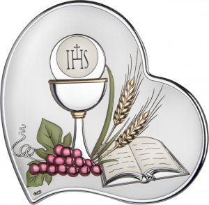 Obrazek srebrny - I Komunia Święta (serce, kolor) 11x11 cm