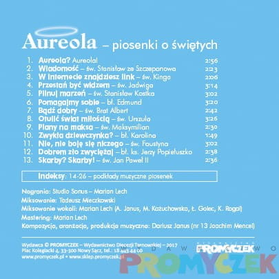 Wspaniałe kompozycje Dariusza Janusa (nr 13 – Joachim Mencel) do słów Justyny Holm śpiewają znakomici artyści: Małgorzata Kożuchowska, Łukasz Golec, Tadeusz Chudecki, Agnieszka Janus, Katarzyna Rogal oraz zespół dziecięcy Promyczki Dobra. Piosenki pochodzące z serii filmów AUREOLA – od Stanisława do Karola w tak wykwintnych interpretacjach nabrały nowego blasku i zapewne pomogą nam jeszcze bardziej pokochać naszych wspaniałych rodaków – świętych i błogosławionych polskiego narodu.