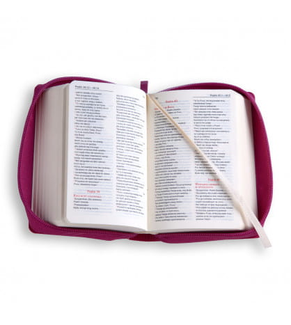 To wydanie Biblii “Tabor” wykończono zintegrowaną oprawą w kolorze malinowym z suwakiem i tasiemką. Gustowne wytłoczenia dodają mu elegancji i stylu.