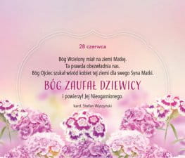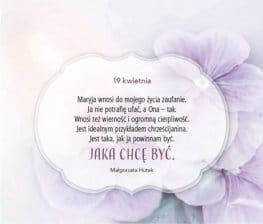 Dla tych kobiet, które chcą rok przeżywać w sposób szczególny z najwierniejszą Przyjaciółką – Maryją, proponujemy codziennik Dobrego dnia z Maryją. Książka zawiera wybrane najpiękniejsze cytaty o Maryi, ale także myśli, które zainspirują do codziennego rozwoju duchowego. Codziennik charakteryzuje subtelna, zwiewna stylistyka graficzna i spójny układ poszczególnych kart. Uwzględnione w nim są także stałe święta i uroczystości maryjne, chociaż nie dotyczy on konkretnego roku. Zawsze warto rozpocząć przyjaźń z Maryją lub zachęcić do niej kogoś bliskiego. Nawet już od dziś!