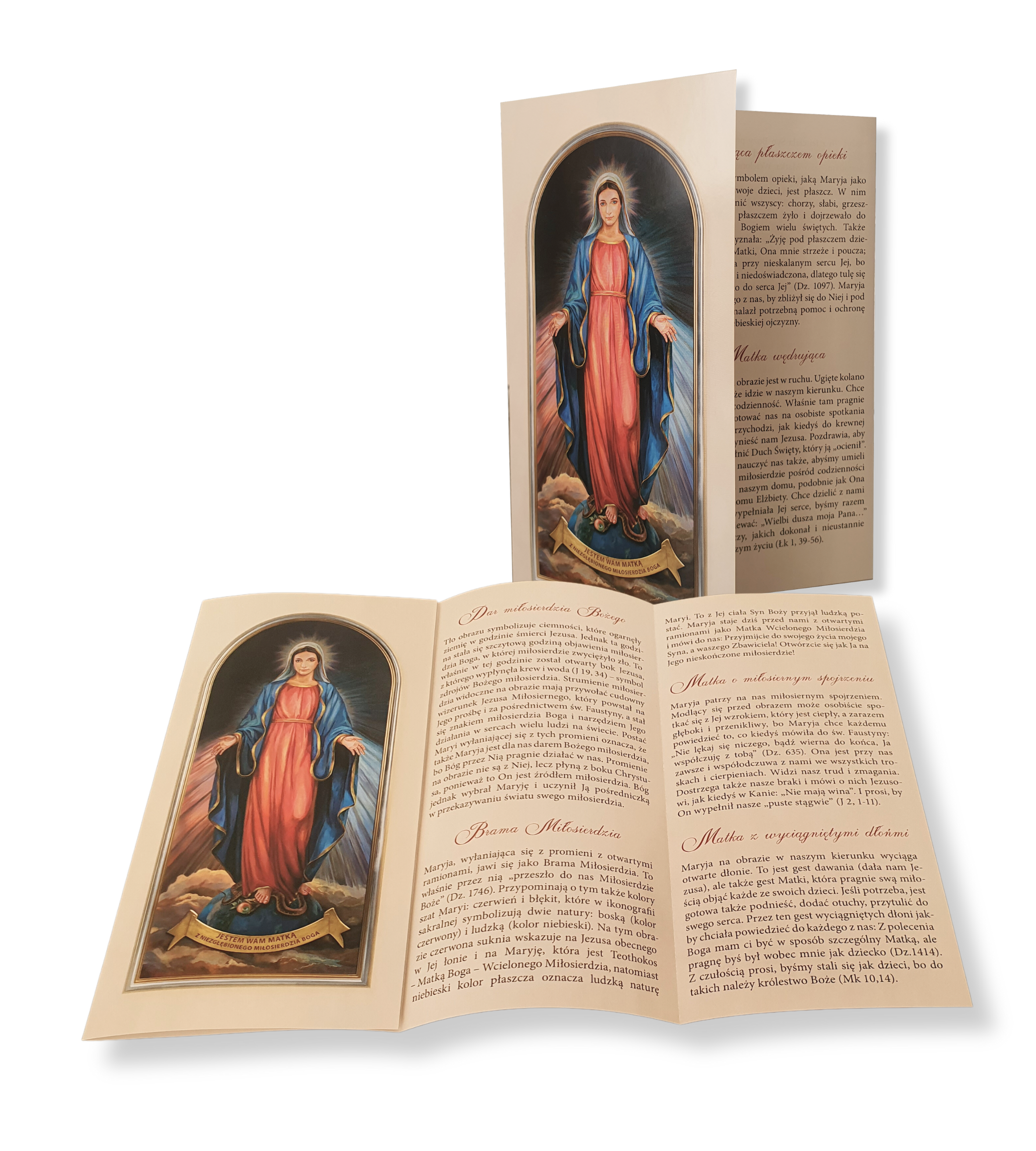 Folderek o symbolice i przesłaniu obrazu Maryi Matki Bożej Miłosierdzia znajdujący się w klasztorze sióstr Zgromadzenia Matki Bożej Miłosierdzia w Krakowie-Łagiewnikach.