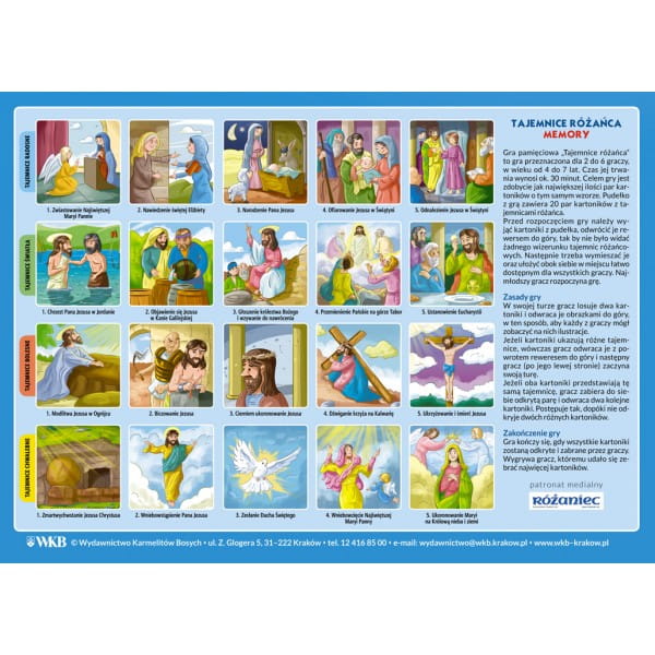 Gra pamięciowa TAJEMNICE RÓŻAŃCA jest przeznaczona dla 2-6 graczy, w wieku od 4-7 lat. Czas jej trwania wynosi ok. 30 minut. Celem gry jest zdobycie jak największej ilości par kartoników o tym samym wzorze. Opakowanie zawiera 20 par kartoników z tajemnicami różańca oraz prezent w postaci świecącego różańca!