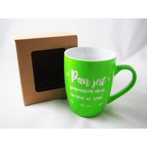 Kubek ceramiczny z wygrawerowanym wersetem biblijnym, co pozwala na mycie w zmywarce.