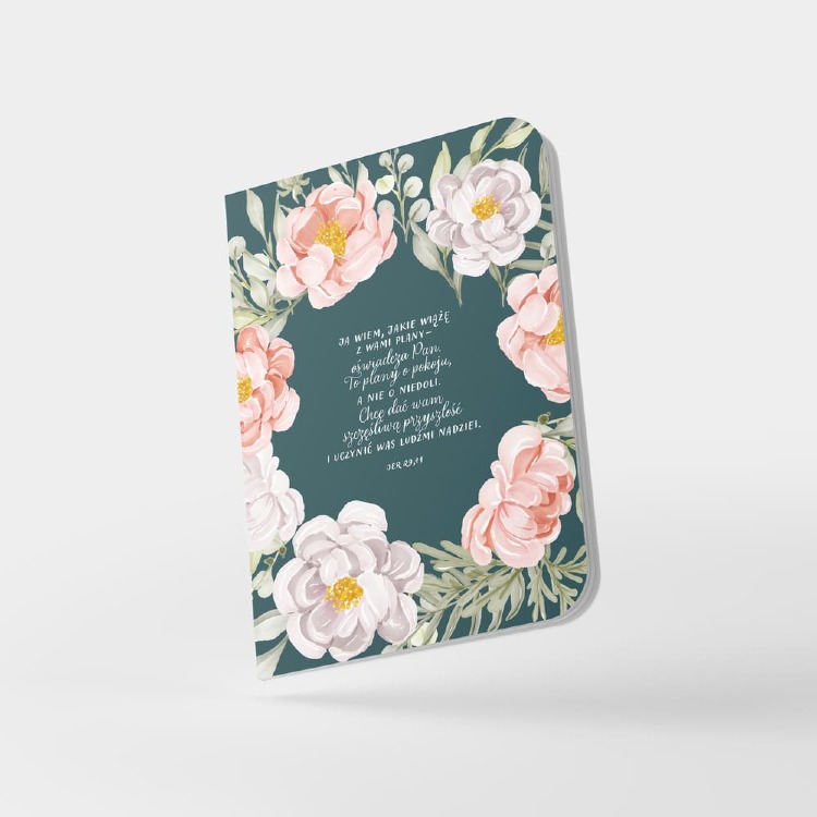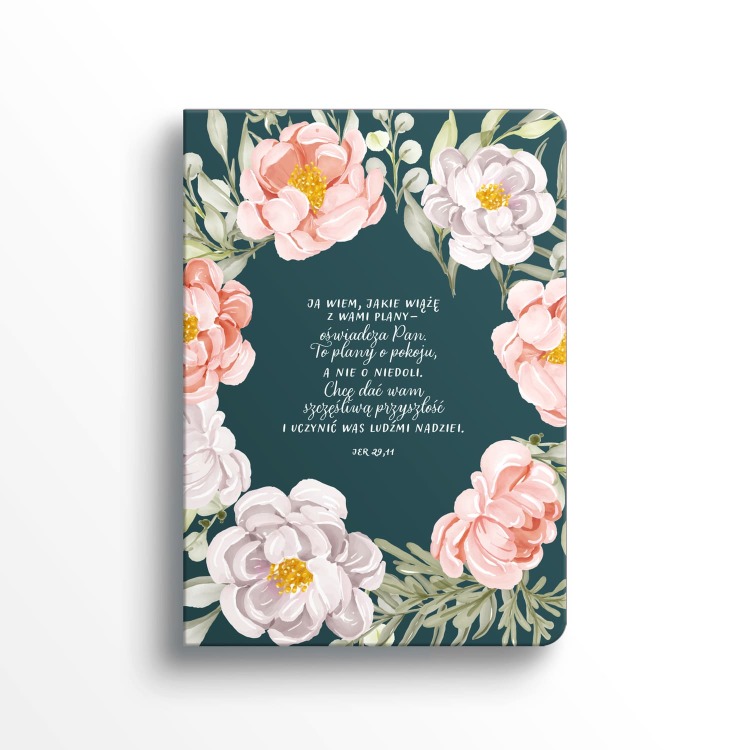 Przepiękny, kwiatowy notatnik z cytatem z Jr 29,11 to wybór dla osób, które kochają elegancję i kolor. Okładka wykonana z ekoskóry, ozdobiona florystyczną ramą, od razu przyciąga wzrok.
