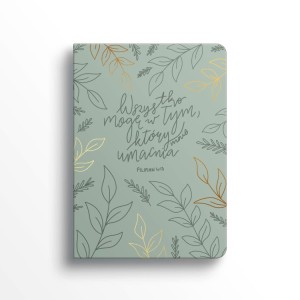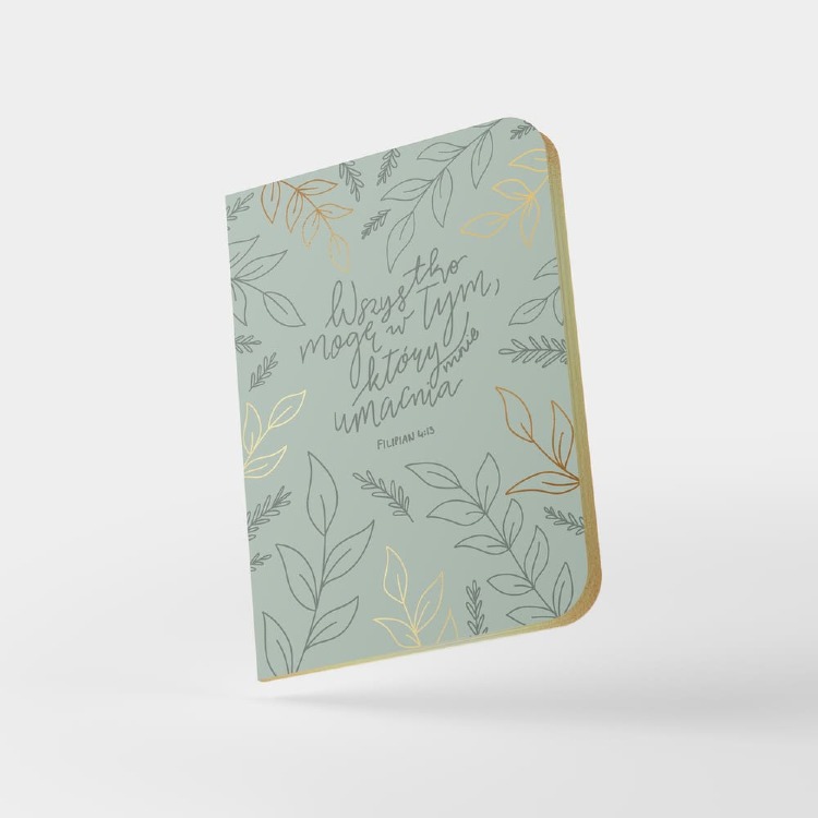Delikatny, pastelowy notatnik „Wszystko mogę w Tym, który mnie umacnia” z listnymi zdobieniami i złoceniem to piękny chrześcijański notes, który inspiruje na każdy dzień. Idealny do journalingu, planowania i modlitewnych zapisków.