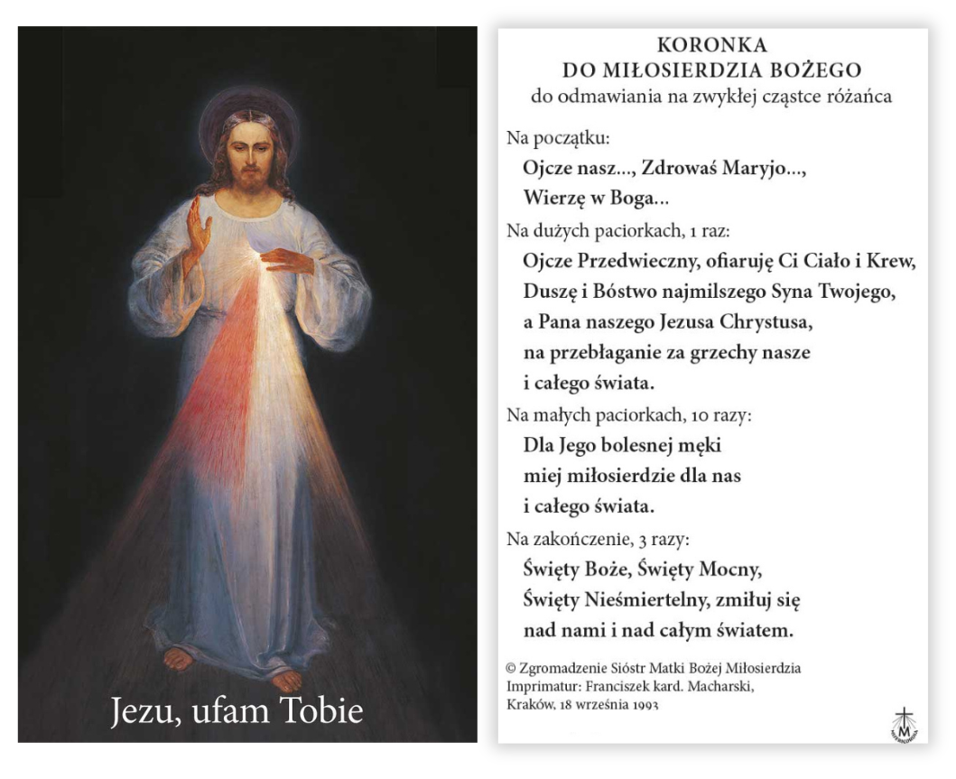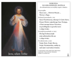 Obrazek z wizerunkiem Jezusa Miłosiernego z Sanktuarium Bożego Miłosierdzia w Wilnie na Litwie. Na rewersie znajduje się tekst koronki do Bożego Miłosierdzia.
