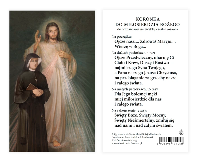 Obrazek z wizerunkiem Jezusa Miłosiernego i św. Siostry Faustyny. Na rewersie znajduje się tekst koronki do Bożego Miłosierdzia.