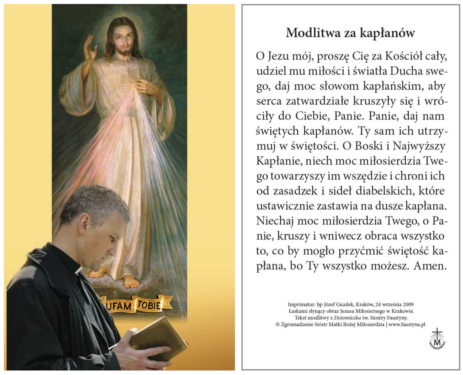 Obrazek na rewersie z tekstem modlitwy za kapłanów z Dzienniczka Siostry Faustyny (Dz. 1052).