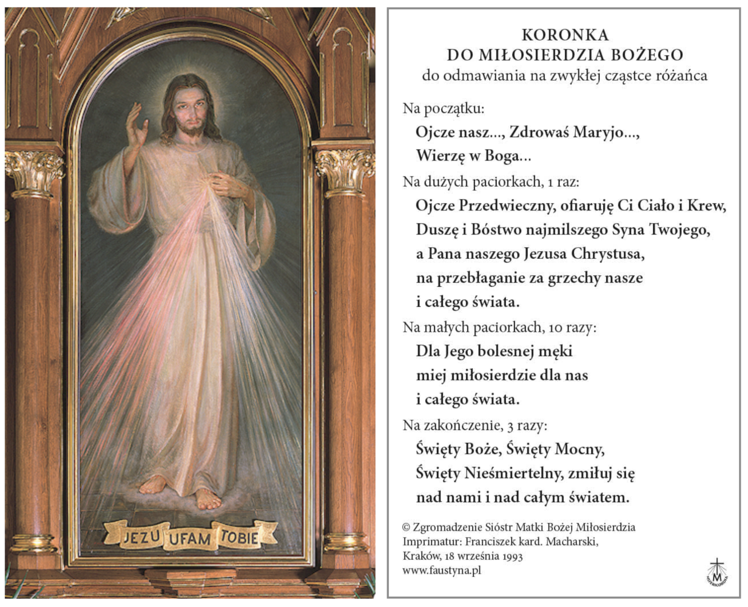 Na rewersie znajduje się tekst koronki do Miłosierdzia Bożego.