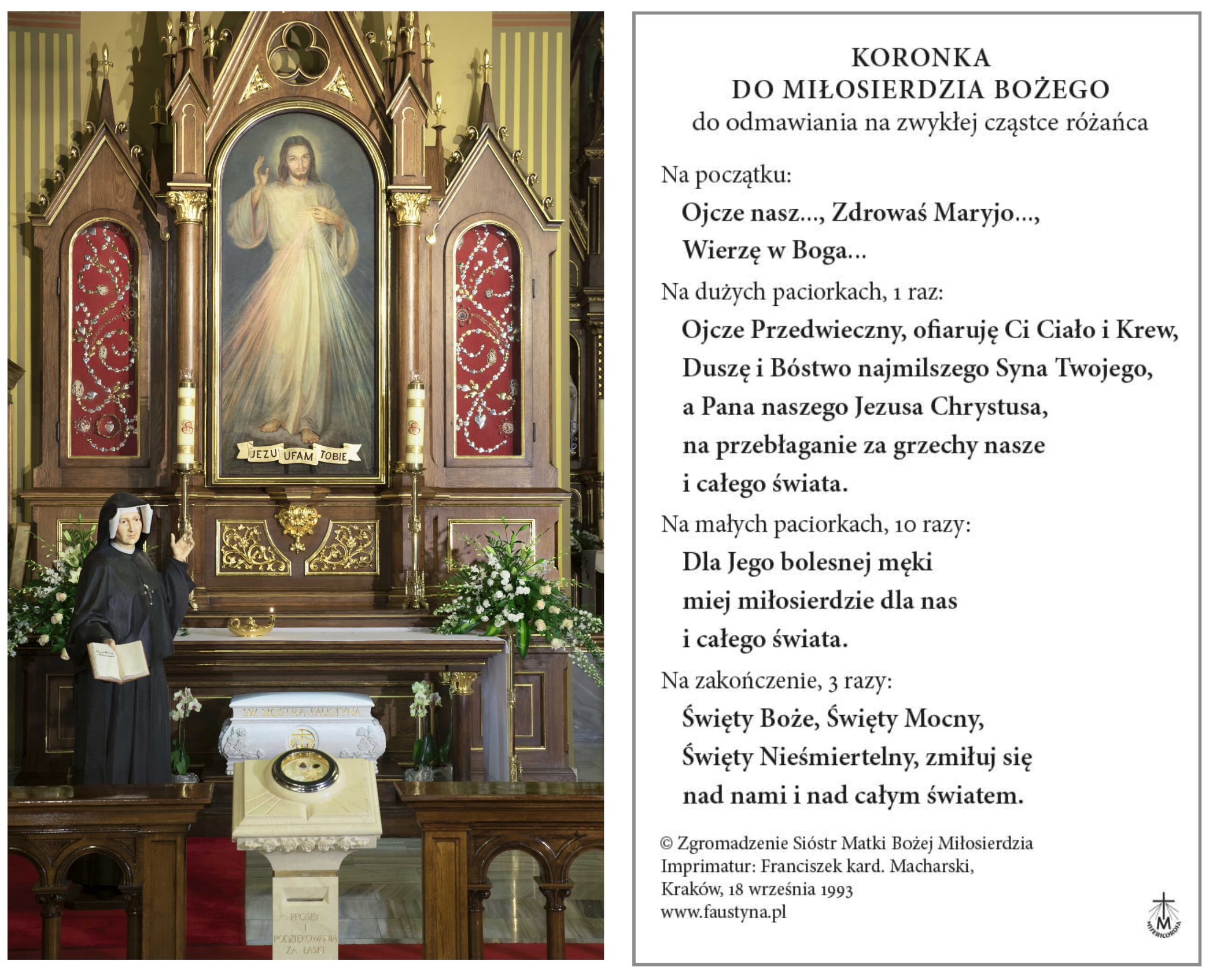 Na awersie obrazka zdjęcie kaplicy z łaskami słynącym obrazem Jezusa Miłosiernego i grobem św. Faustyny. Na rewersie znajduje się tekst koronki do Miłosierdzia Bożego.