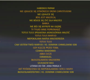 Płyta składa się z utworów znanych i lubianych, które są związane ze świętym papieżem jak np. Barka, Czarna Madonno oraz hymny Światowych Dni Młodzieży: ABBA Ojcze (Częstochowa – 1991), Emmanuel (Rzym – 2000), Błogosławieni Miłosierni (Kraków – 2016). Dodatkowo nasz „specjalista od litanii” Piotr Nowak przygotował muzykę i zaśpiewał nową wersję litanii do św. Jana Pawła II. Płyta zawiera również hymn zespołu, który towarzyszy od samego początku istnienia AJIM-u pt. „Niepokalana Matka Miłosierdzia”, w tym razem w nowej aranżacji.