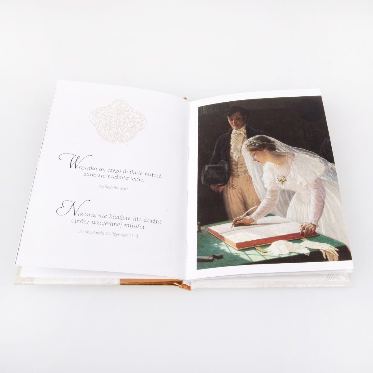 Książeczka przygotowana z okazji ślubu, by uczcić ten wyjątkowy dzień i sprawić radość nowożeńcom. Wydana z dbałością o każdy szczegół, pełna cytatów dotyczących miłości, małżeństwa i wspólnej drogi ? pięknej, ale i trudnej, może stanowić cenną pamiątkę dnia zawarcia sakramentu małżeństwa. Całość dopełniają urokliwe, wręcz sielskie reprodukcje obrazów malarzy m.in. epoki wiktoriańskiej i francuskiego impresjonizmu.