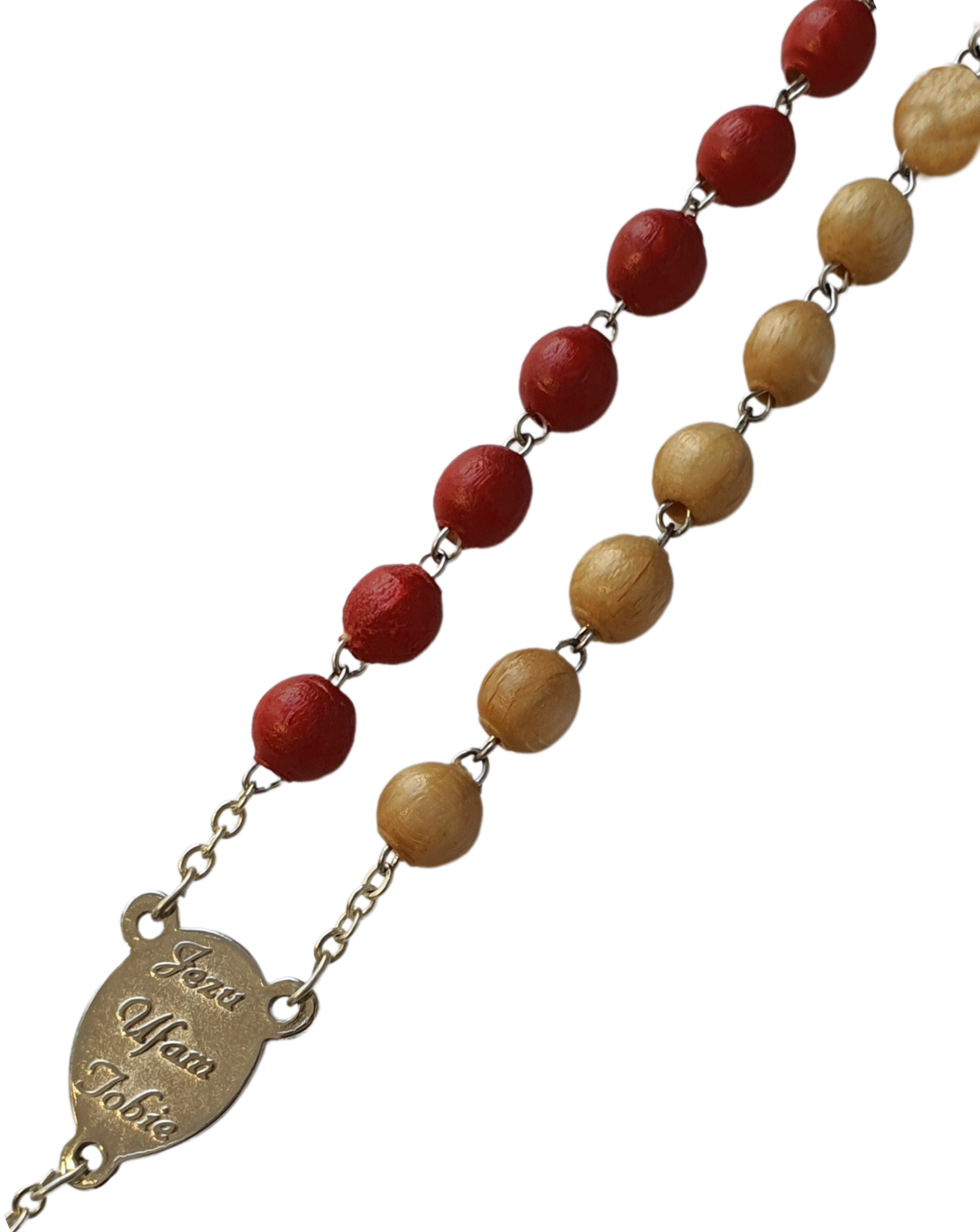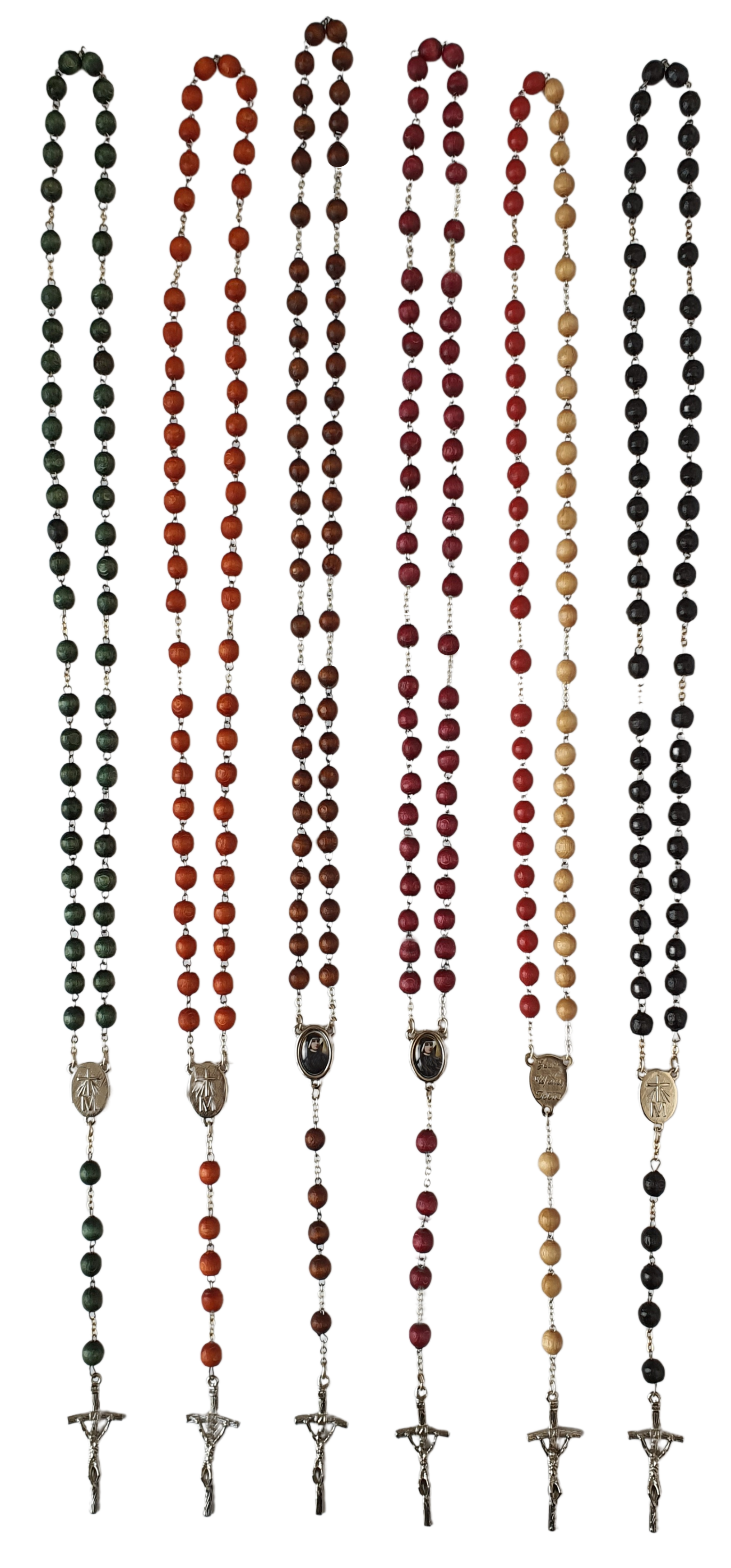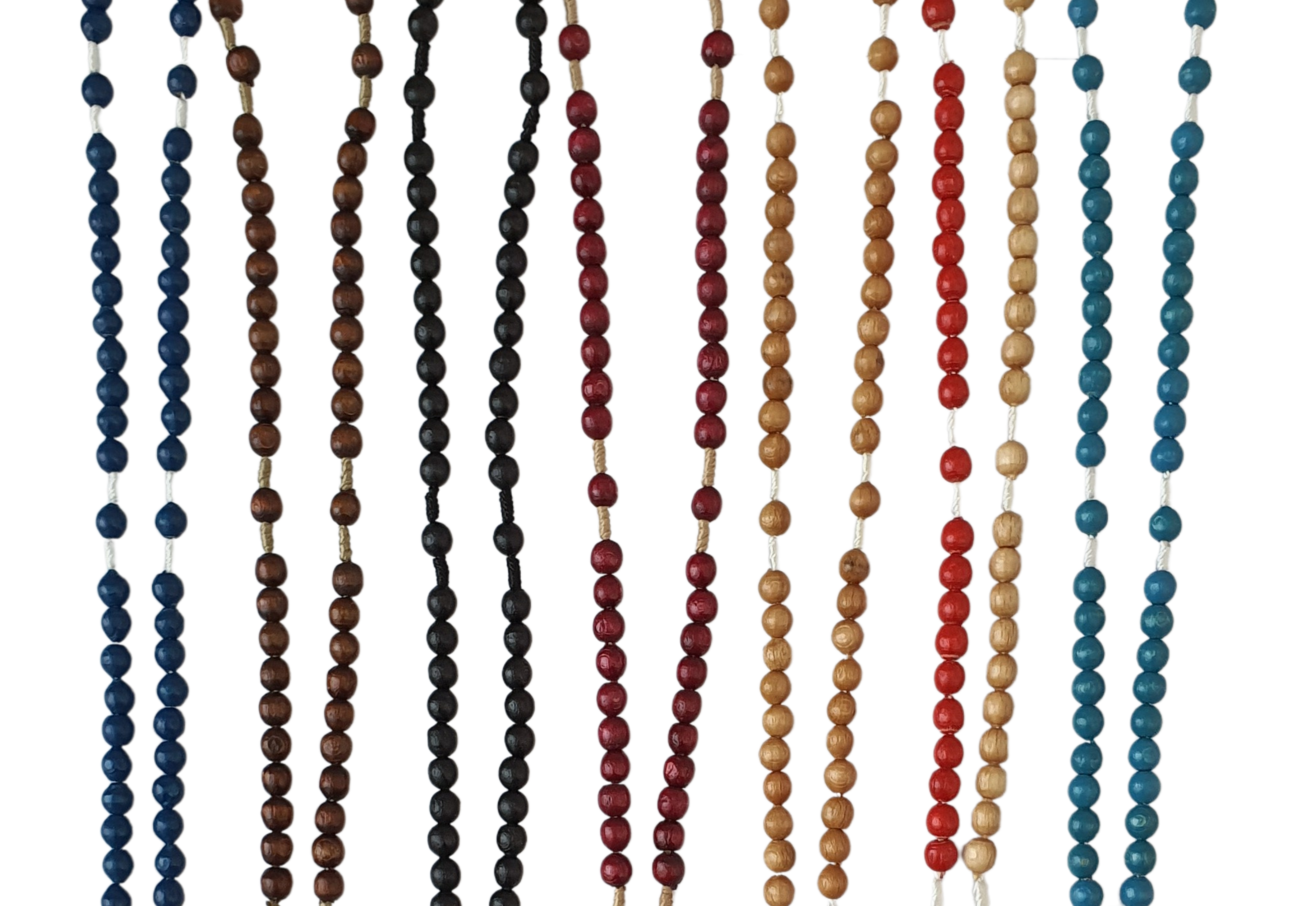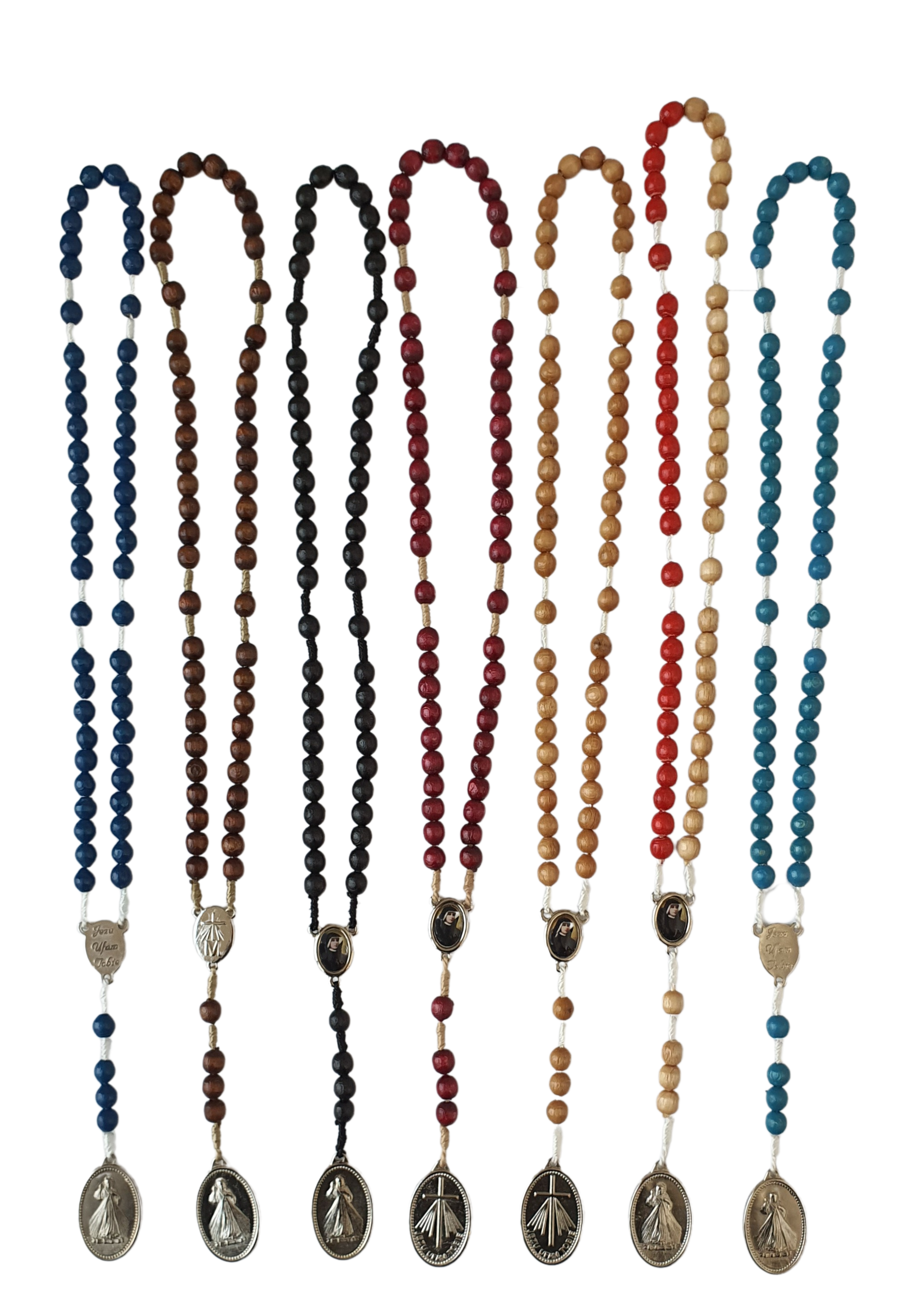 Różaniec/koronka z drewna. Dostępny na sznurku lub łańcuszku, z krzyżykiem lub medalionem w różnych kolorach.