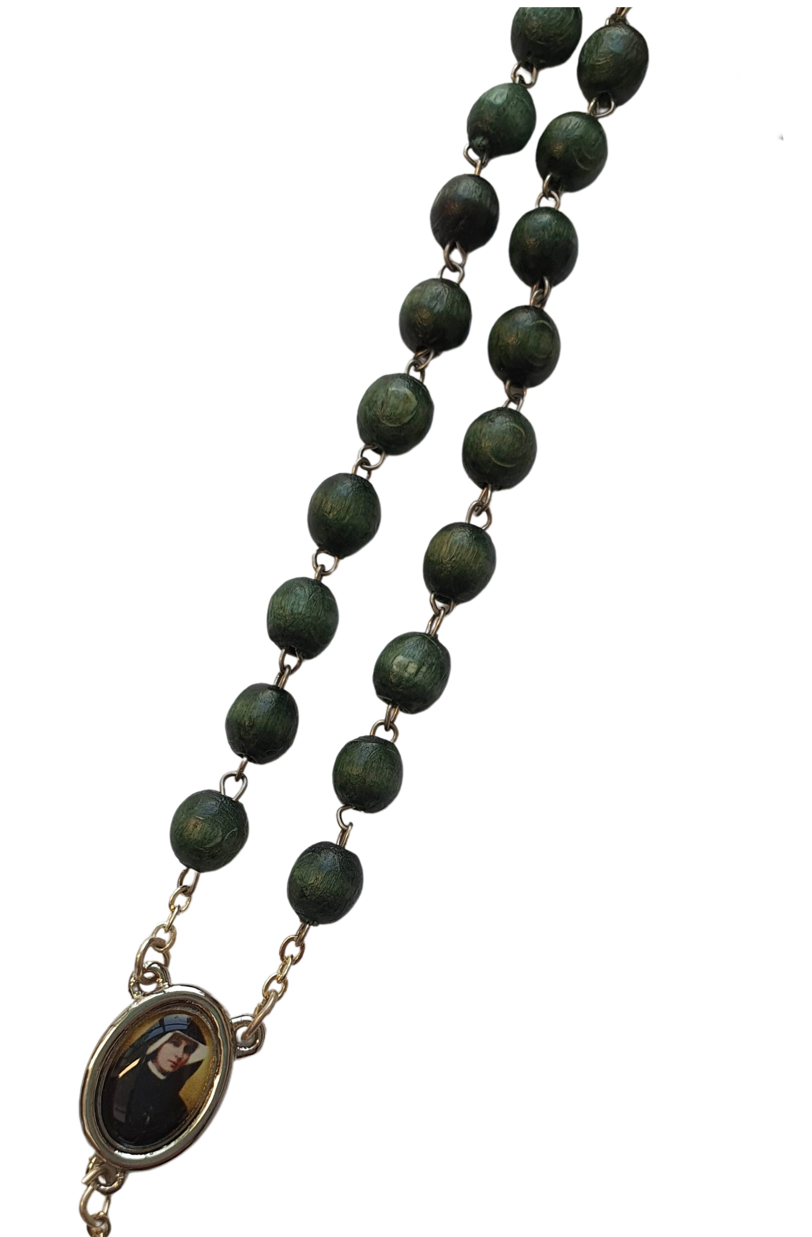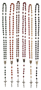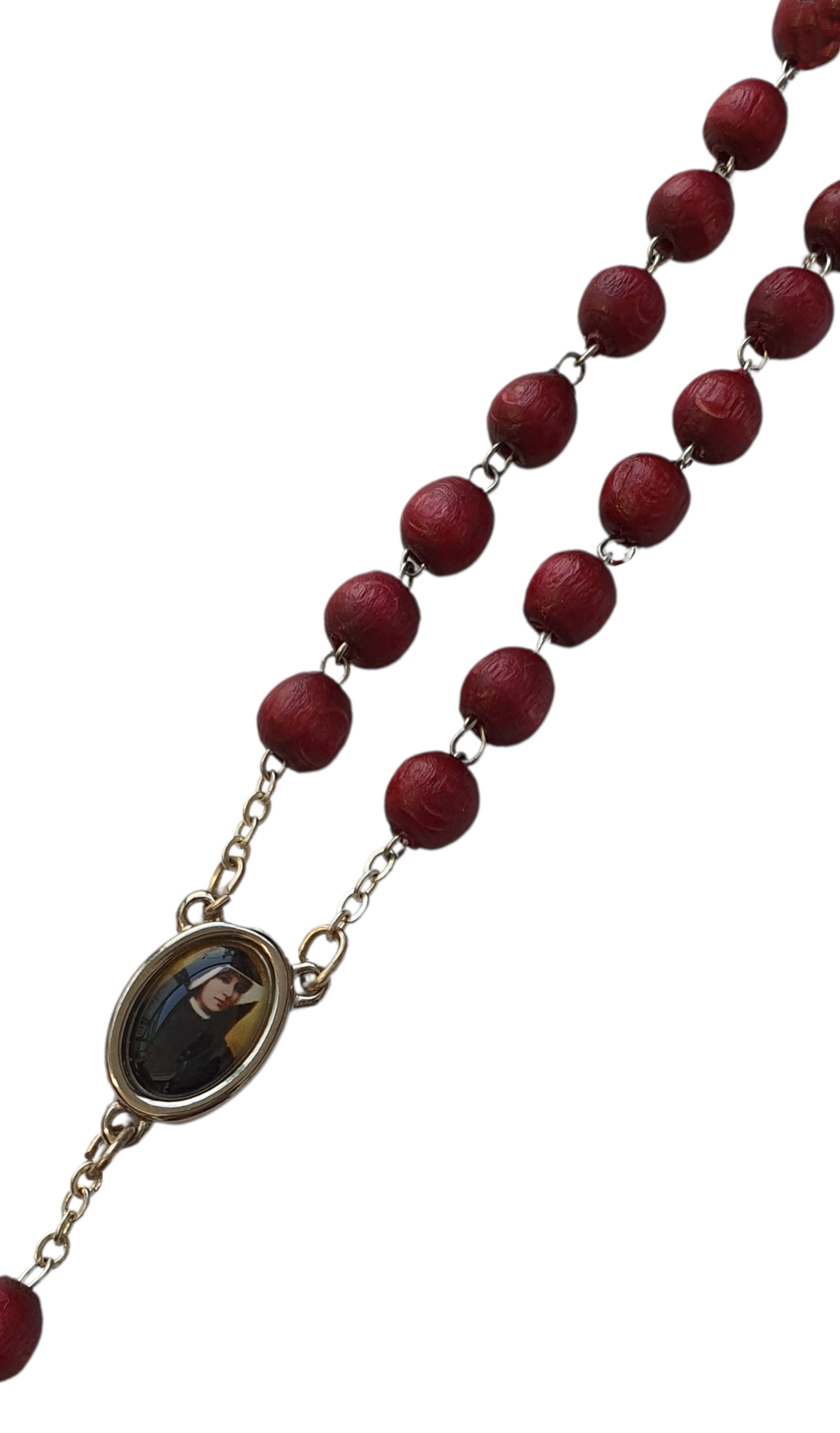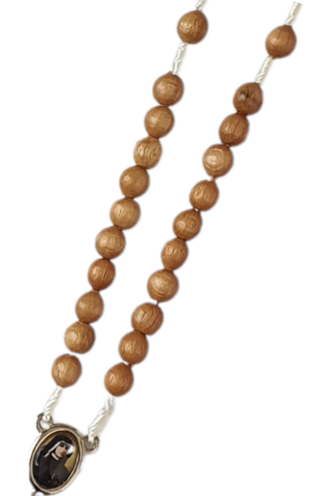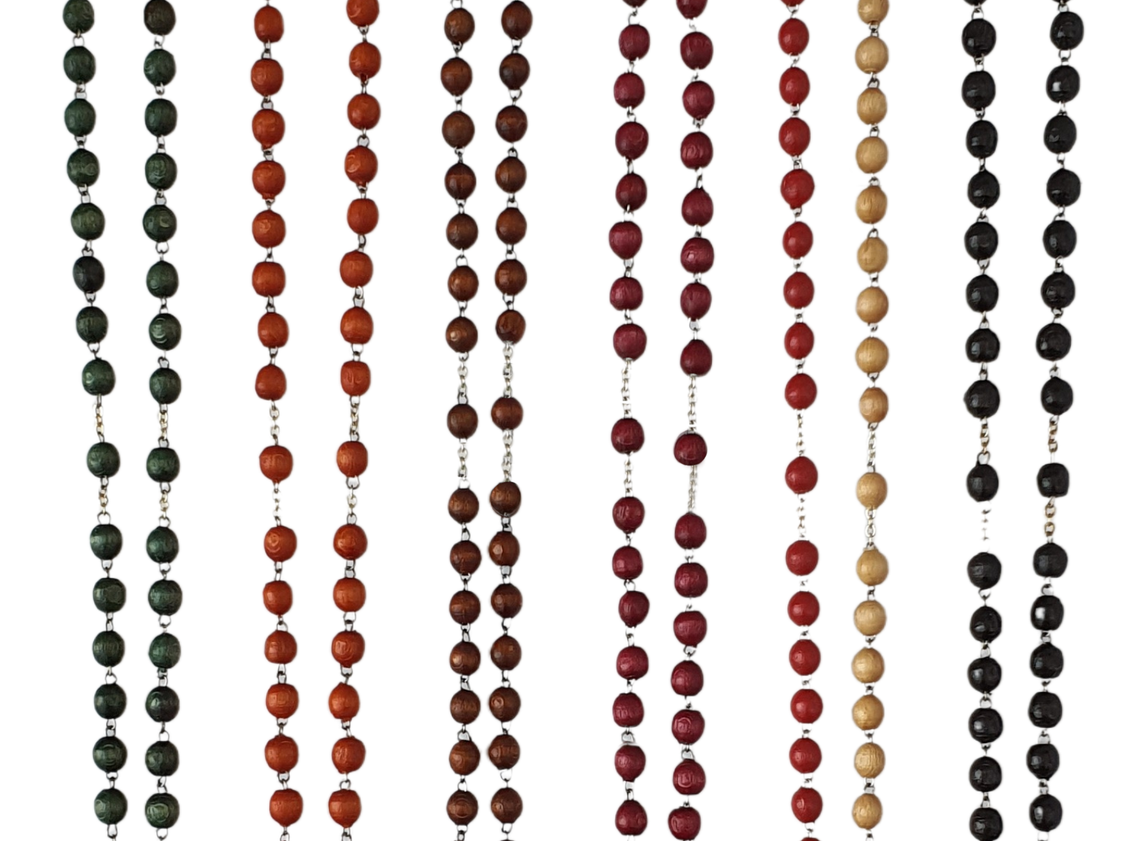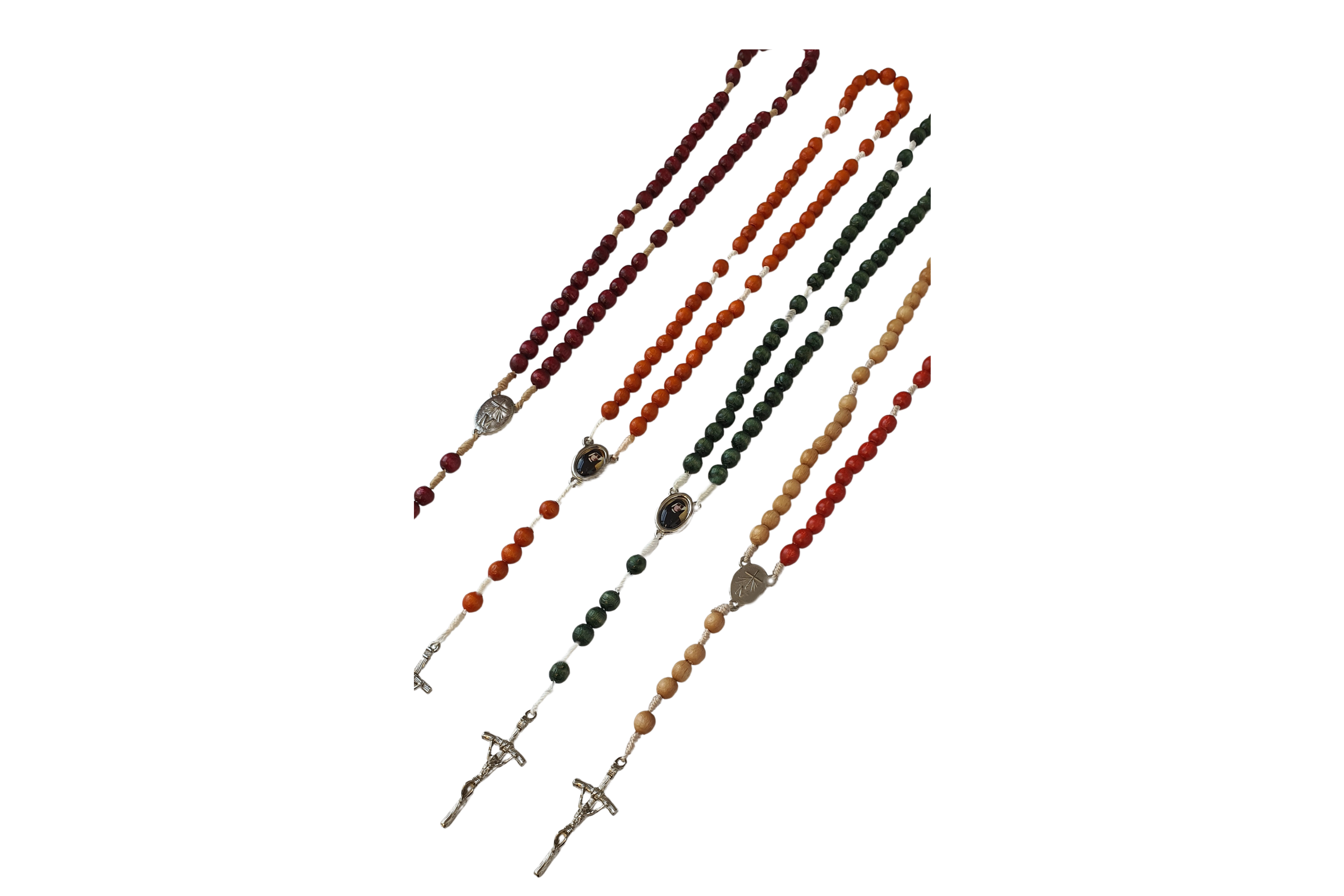 Różaniec/koronka z drewna. Dostępny na sznurku lub łańcuszku, z krzyżykiem lub medalionem w różnych kolorach.