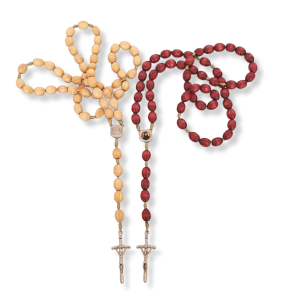 Różaniec drewniany na sznurku z grubymi paciorkami.